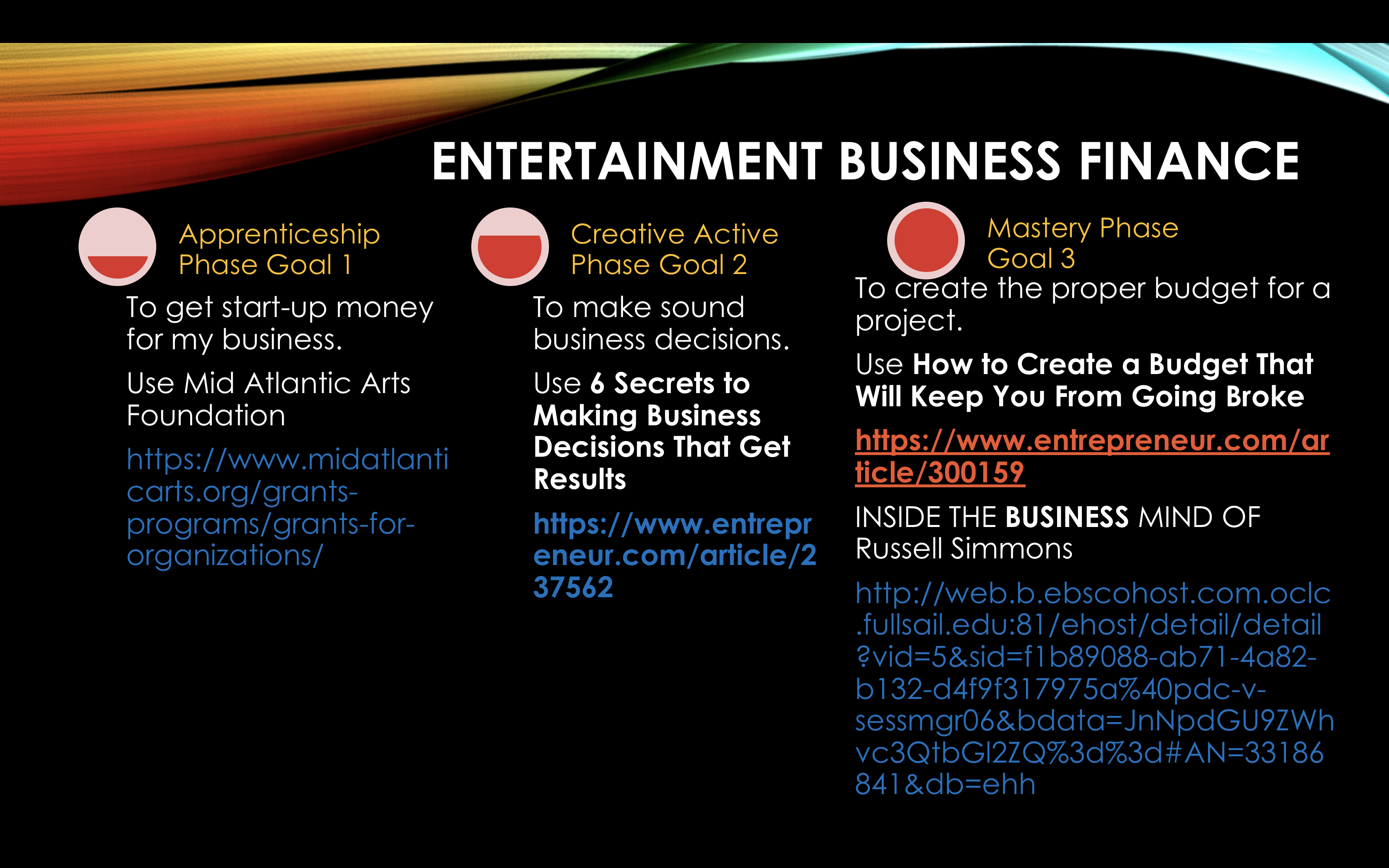 The intent of this Statement is to formally express an interest in attending Full Sail University for the sole purpose of attaining a Masters Degree in Business Entertainment. This investment would allow me to delve deeper into the entertainment world, be able to network, have a better understanding of laws associated with entertainment, teach me the how to’s of the business side, work with new technologies, and accomplish my goal of developing my own production company. The education process is essential to the development of my future business goals and the process in which one run’s a company. I firmly believe that with my experience and the education, I can efficiently accomplish the goal I set forth for myself.